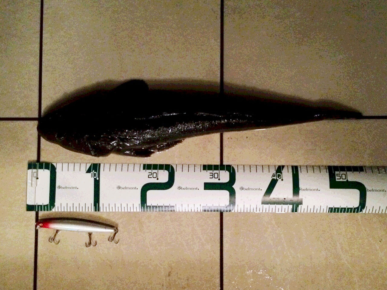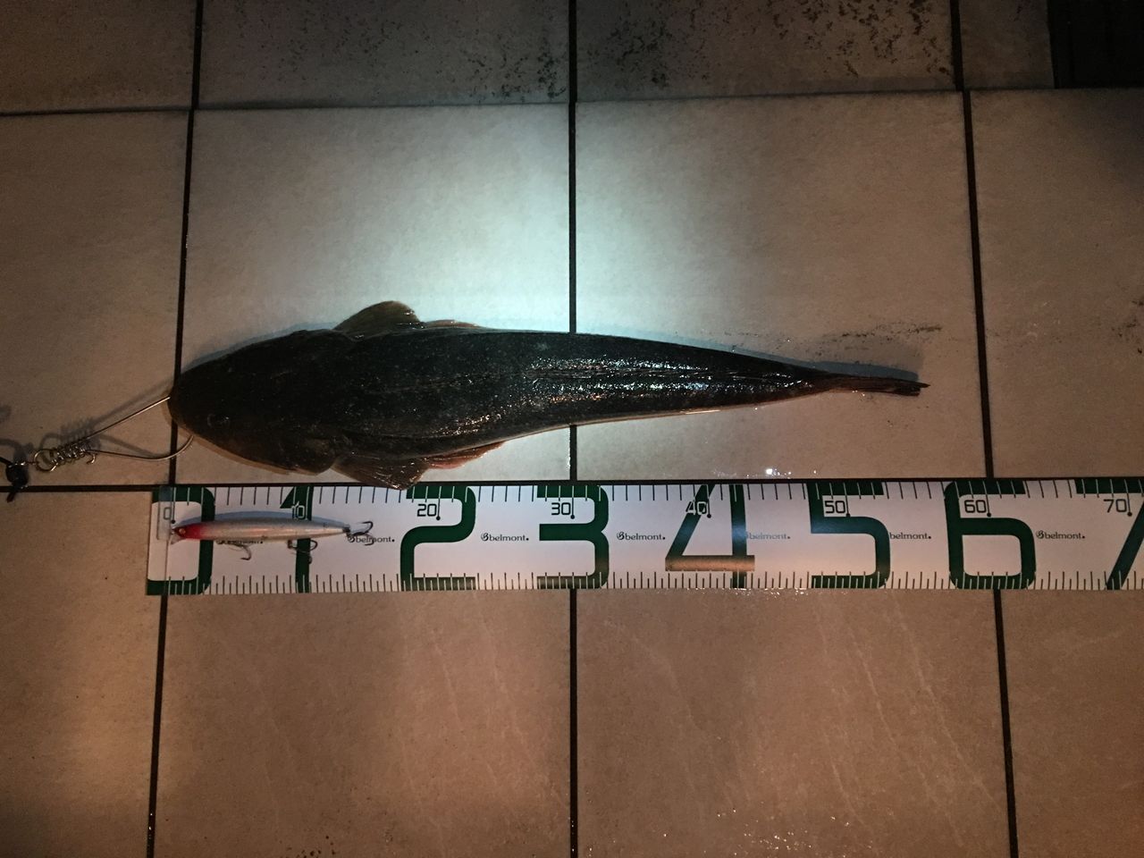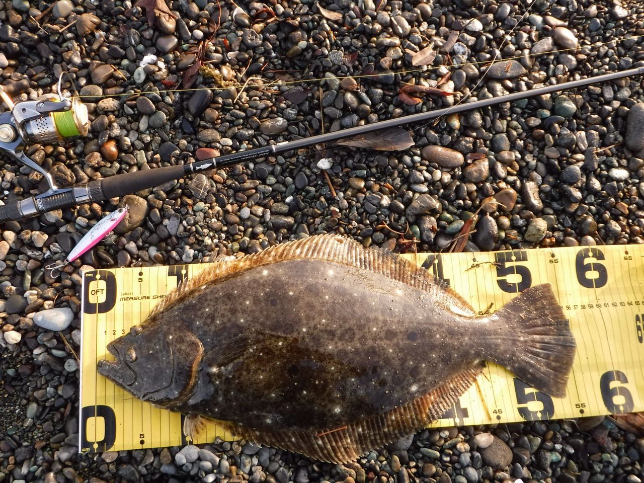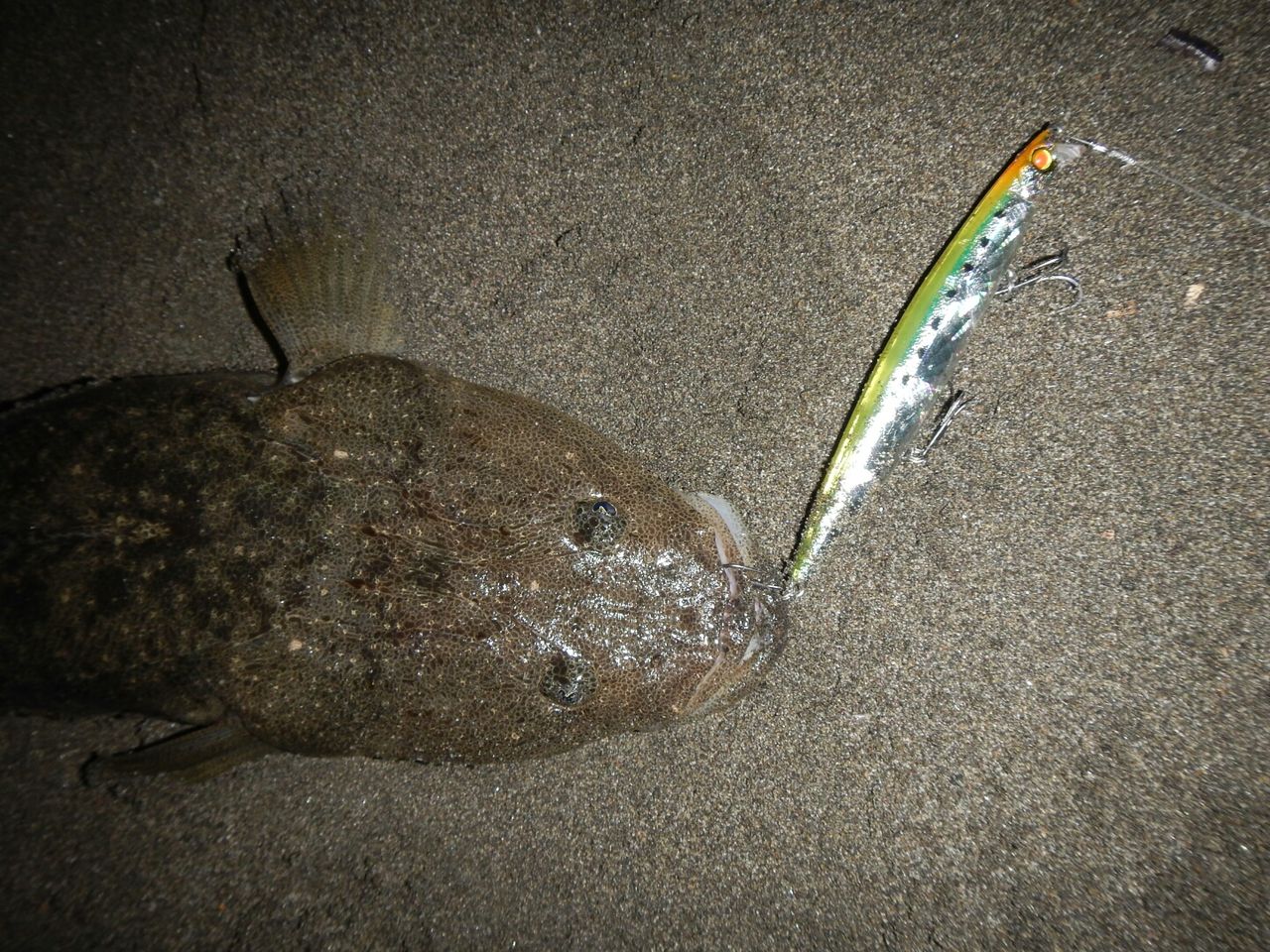 「サルディナ127F」レッドヘッド(レーザーホロ)でマゴチ53cmを獲りました。水深30cmくらいの所のブレイクラインをスローで流すとガツンときました。