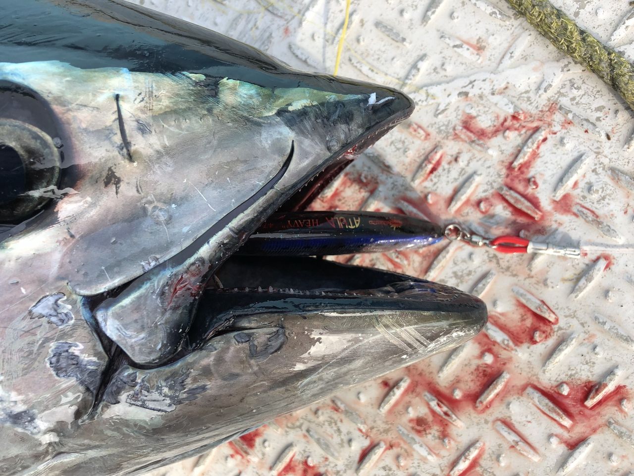 PE4号タックルだった為、無理なファイトができず約20分掛かってしまいましたが今年初マグロをGETできました!津軽海峡ど真ん中の潮が速いポイントでしたが釣り上げることができたのは付属のフックもさることながらルアーの強度もかなりの物と実感できました。